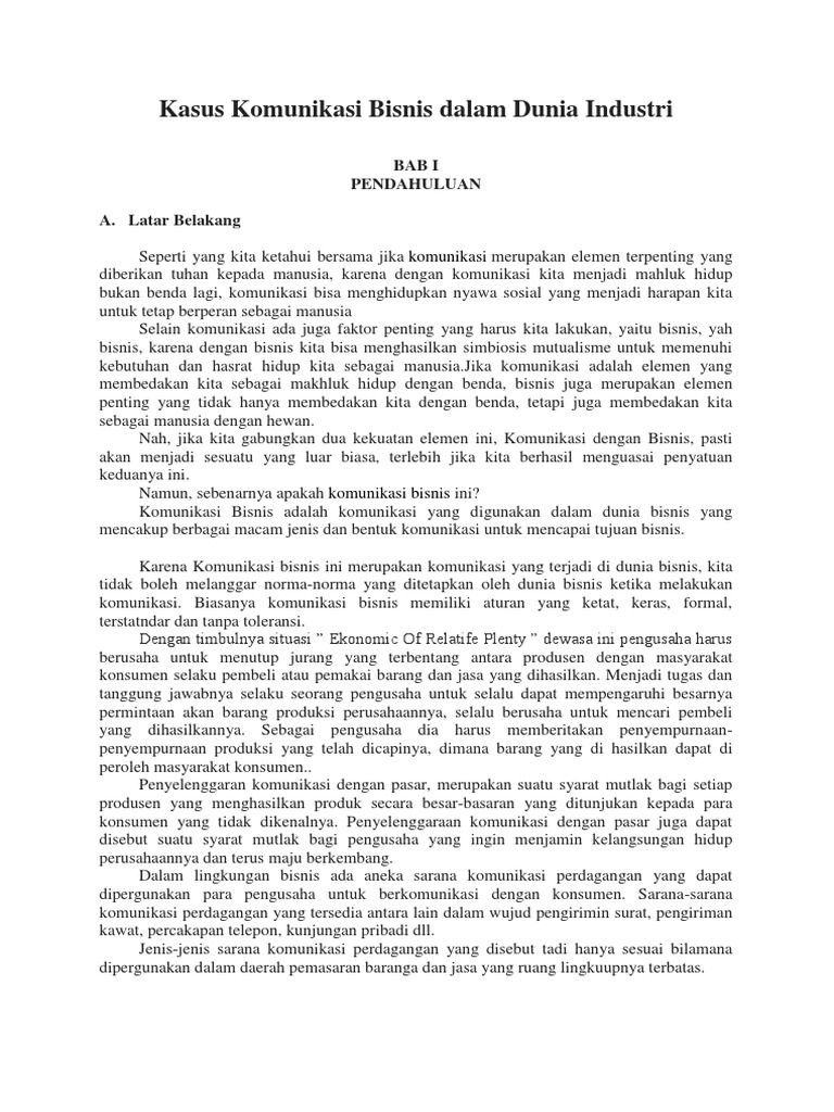 Contoh Kasus Komunikasi Bisnis Nama : Nurul Fiqih Budianti. Kelas : 2df02 . Npm : 56213721. Tugas : S oftskill ( komunikasi bisnis ) ke-1. Pengertian komunikasi bisnis ... Beri pelatihan dalam hal komunikasi kepada atasan dan karyawan, ...