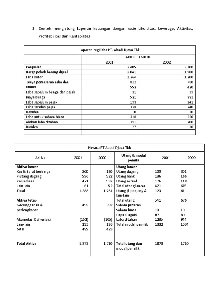 Rasio ini menunjukkan seberapa besar penjualan untuk modal kerja yang dimiliki perusahaan. Rasio ini dapat menilai likuiditas dari total aktiva dan posisi modal kerja. Demikianlah penjelasan tentang Pengertian Likuiditas, Rumus dan Contoh Rasio Likuiditas semoga bermanfaat untuk pembaca AkuntansiLengkap.com. Sekian dan terimakasih. Jajaran direksi Bank Mandiri menggelar jumpa pers terkait paparan kinerja Bank Mandiri 2021 di Jakarta, Kamis. (ANTARA/HO-Mandiri) Jakarta (ANTARA) - PT Bank Mandiri (Persero) Tbk membukukan laba bersih senilai Rp28,03 triliun sepanjang 2021 lalu atau tumbuh 66,8 persen dibandingkan laba tahun sebelumnya yang mencapai Rp17,11 triliun. Analisis Rasio Keuangan - Penggunaan rasio keuangan umumnya bermacam-macam tergantung dari kepentingan sendiri begitupun perbedaan pada jenis perusahaan juga bisa membedakan rasio-rasionya.. Nah pada pembahasan kali ini saya akan membahas mengenai Macam-Macam Rasio Keuangan, Rumus Rasio dan cara membaca rasio keuangan. 1.1. Pengertian Rasio Keuangan Bank Menurut para ahli, adapun pengertian Rasio Keuangan Bank adalah sebagai berikut : Van Horne dan Wachowizs (1997:133) "Indeks yang menghubungkan dua angka akuntansi dan diperoleh dengan membagi satu angka dengan angka lainnya."Bambang Riyanto (2001:329) "Rasio keuangan adalah ukuran yang digunakan dalam interpretasi dan analisis laporan finansial suatu ...