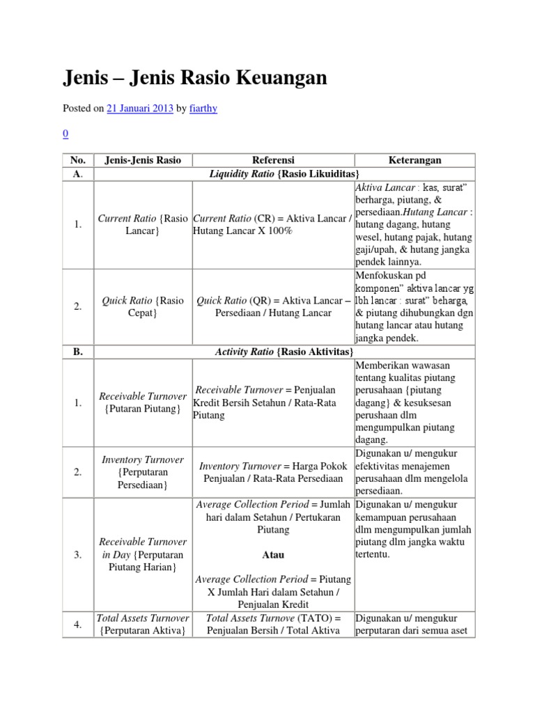 Macam-Macam Rasio Keuangan Rasio keuangan menjelaskan suatu hubungan antara suatu jumlah tertentu dengan jumlah yang lain dalam suatu laporan keuangan. Tujuan analisis rasio keuangan dimaksudkan agar perbandingan-perbandingan yang dilakukan terhadap pos-pos dalam laporan keuangan merupakan suatu perbandingan yang logis, dengan menggunakan ukuran-ukuran tertentu yang memang telah diakui ...