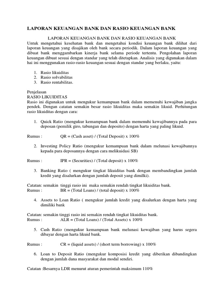 Rumus rasio keuangan bank. Rumus rasio keuangan bank Rasio keuangan merupakan alat untuk menganalisis keuangan sebuah perusahaan dalam menilai kinerja bisnis yang dilakukan. Analisis yang dilakukan pun bermacam-macam sesuai tujuan pengukurannya, yakni rasio likuiditas , rasio solvabilitas (leverage), rasio retentabilitas (provabilitas), dan rasio aktivitas. Kejahatan siber atau *cybercrime* memiliki banyak bentuk di dunia yang serba digital ini. Salah satu bentuknya adalah *Doxing*. Pernahkah Anda mendengar istilah apa itu *Doxing?* Kini, seseorang dapat dengan mudah mencari data pribadi orang lain, baik melalui media sosial ataupun platform *website*. Tentunya hal tersebut memberikan kemudahan, namun juga kerugian bagi setiap penggunanya. Pencarian data yang disalah gunakan merupakan sebuah tindak kriminal yang dapat merugikan pihak lain, sepert... Hello komodos, Setelah [komen](https://www.reddit.com/r/finansial/comments/qk8yoi/investasi_p2p_lending/hiv0xpt/?utm_source=share&utm_medium=ios_app&utm_name=iossmf&context=3) di thread sebelah tentang pengalaman buruk gue di P2P lending, jadi akhirnya kepikiran bikin thread ini. Share dong ttg keputusan finansial yg terburuk dan terbaik yg pernah kalian lakukan disini. Gue mulai ya dari yg terburuk: - 2015: apply CC dari salah satu retailer di DE saat masih jadi student soalnya n... CAMEL menjadi tolak ukur suatu objek pemeriksaan bank yang dilakukan oleh pengawas bank, dan erdapat lima aspek untuk menilai kinerja perusahaan perbankan umumnya, yaitu: (1) capital, (2) assets, (3) management, (4) earnings, dan (5) liquidity yang biasa disebut CAMEL. Karena aspek-aspek tersebut menggunakan rasio keuangan, menunjukan ...