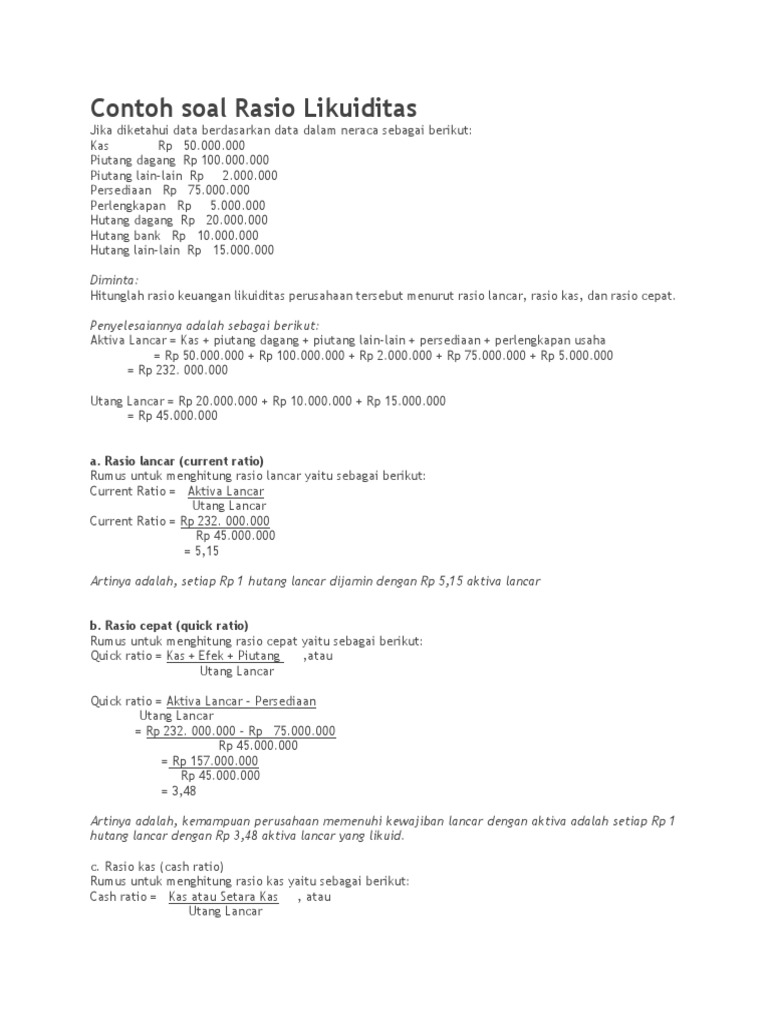 Rumus rasio keuangan cepat adalah berikut: ... bank dalam bentuk rekening koran. Rasio NIM juga dapat dipakai sebagai indikator mengenai kesehatan keuangan sebuah perusahaan serta proyeksi pertumbuhannya di masa depan. Sebagai contoh, Bank X mempunyai NIM sebesar 4,9% pada tahun 2020. Artinya dari keseluruhan total aset produktif yang dipunyai oleh Bank X, maka 4,9% di antaranya dapat diubah menjadi pendapatan laba bersih. Pengertian Rasio Keuangan Bank. Pada dasarnya rasio keuangan merupakan indeks yang menghubungkan antara dua angka akuntansi atau lebih yang diperoleh dengan cara membagi satu atau lebih angka dengan angka lainnya. Nilai atau indek dari rasio keuangan digunakan untuk mengevaluasi kondisi keuangan dan kinerja perusahaan. Pengertian Ratio Solvabilitas