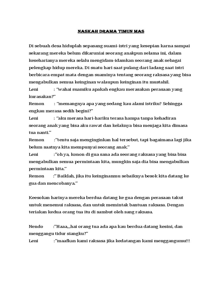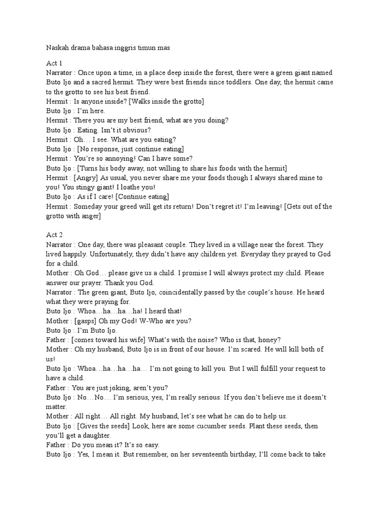 Bahasa Inggris, Naskah Drama Timun Mas - Scribd Bahasa Inggris, Naskah Drama Timun Mas - Free download as Word Doc (.doc), PDF File (.pdf), Text File (.txt) or read online for free. Scribd is the world's largest social reading and publishing site. Open navigation menu