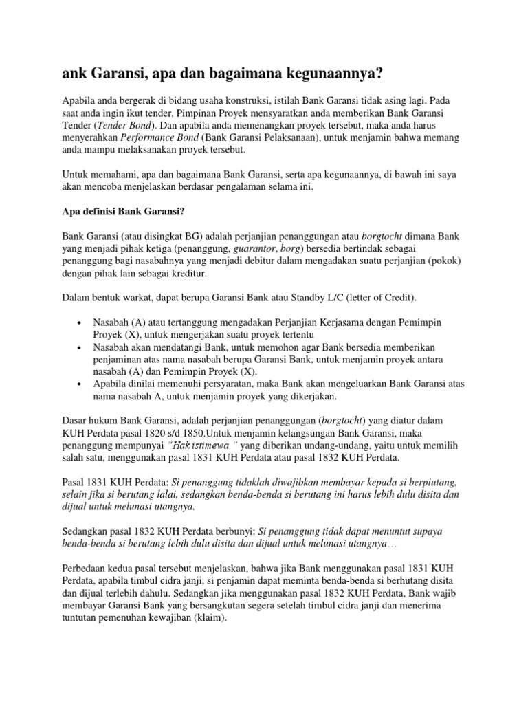 Jaminan Pelaksanaan Surety Bond Jaminan Proyek Konstruksi Sedangkan Surety Bond termasuk salah satu jenis asuransi untuk perlindungan dari risiko wanprestasi kontrak. Bank Garansi (Bank Guarantee) menjamin realisasi transfer uang sesuai perjanjian dari pembeli kepada penjual. Daripada mengirim pembayaran langsung kepada penjual, pembeli akan membuat Bank Garansi dan mengirimkannya kepada penjual.