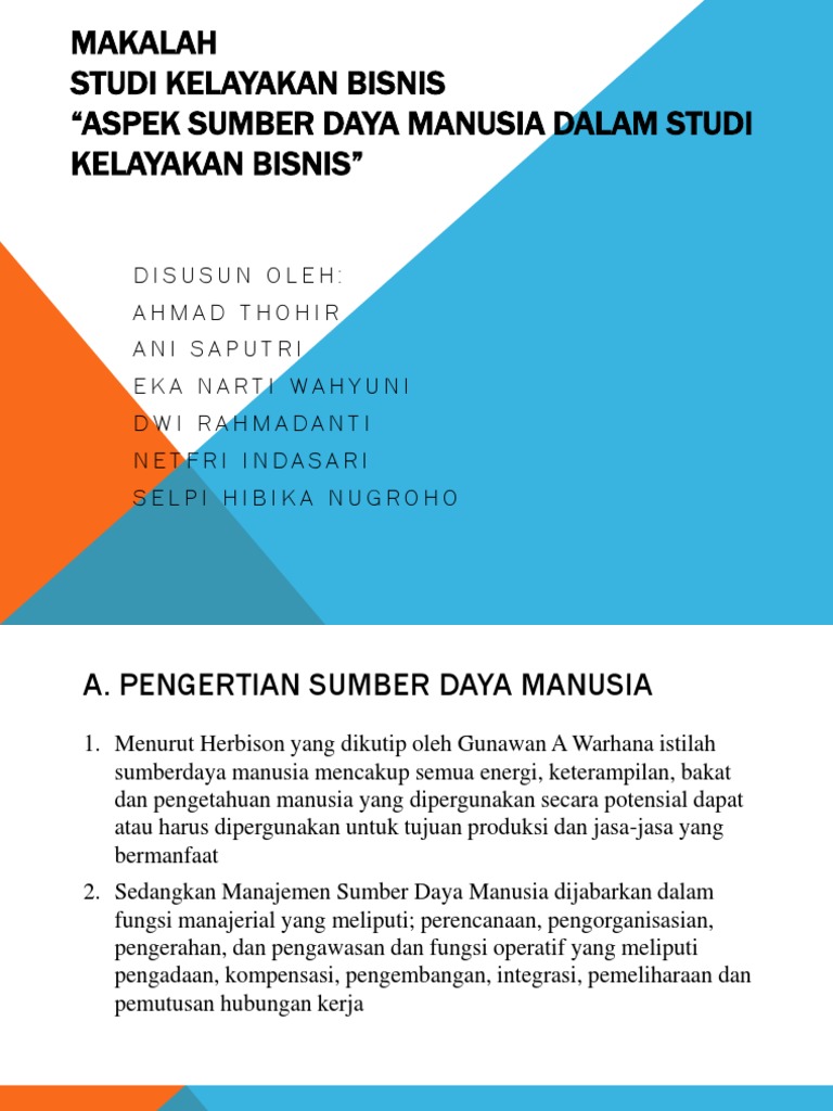 (DOC) Aspek Sumber Daya Manusia Studi Kelayakan Bisnis - Academia.edu Nov. 1993 Susilo Heru, 1995, Mencari Strategi Pengembangan Sumber Daya Manusia dalam Organisasi, Malang, Unibraw dan IKIP Malang. f. Related Papers. ASPEK SUMBER DAYA MANUSIA DALAM. By Tria Meildha. MAKALAH STUDI KELAYAKAN BISNIS "Hubungan Studi Kelayakan Bisnis dan Sumber Daya Manusia". By Indra Y U S U F 27. 43 makalah aspek manajemen dalam studi kelayakan bisnis - Seputar ... Aspek SDM Dalam Studi Kelayakan Bisnis - Toilet Bisnis Aspek SDM dalam studi kelayakan bisnis merupakan fokus terpenting dalam sektor perkembangan ekonomi. Hal ini berlaku juga di negara kita Indonesia. Di samping itu, Indonesia sedang terguncang dalam sektor ekonomi. Hal tersebut dapat dilihat dari pengeluaran yang belum stabil.