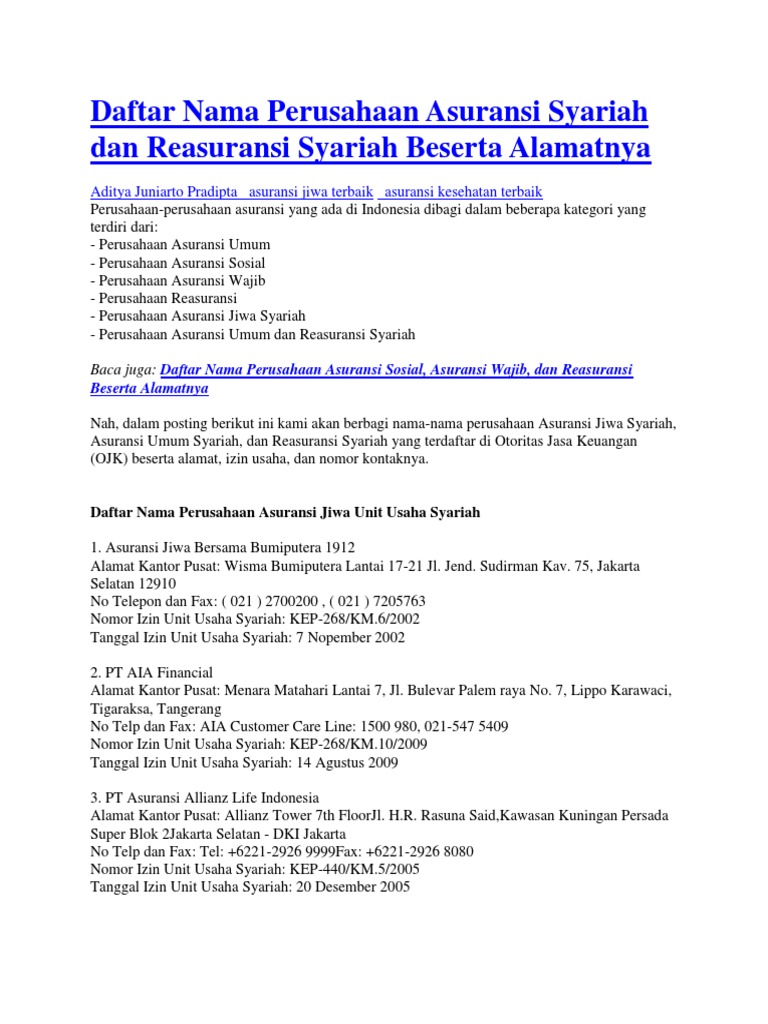 Daftar perusahaan asuransi Indonesia - Wikipedia bahasa ... Berikut adalah daftar perusahaan asuransi di Indonesia berdasarkan kelompok risiko yang diterbitkan oleh Otoritas Jasa Keuangan ( OJK) per tanggal 31 Desember 2015. Secara umum OJK membaginya menjadi: Perusahaan Asuransi Umum, sebanyak 76 perusahaan Perusahaan Asuransi Jiwa, sebanyak 50 perusahaan Perusahaan Reasuransi, sebanyak 6 perusahaan