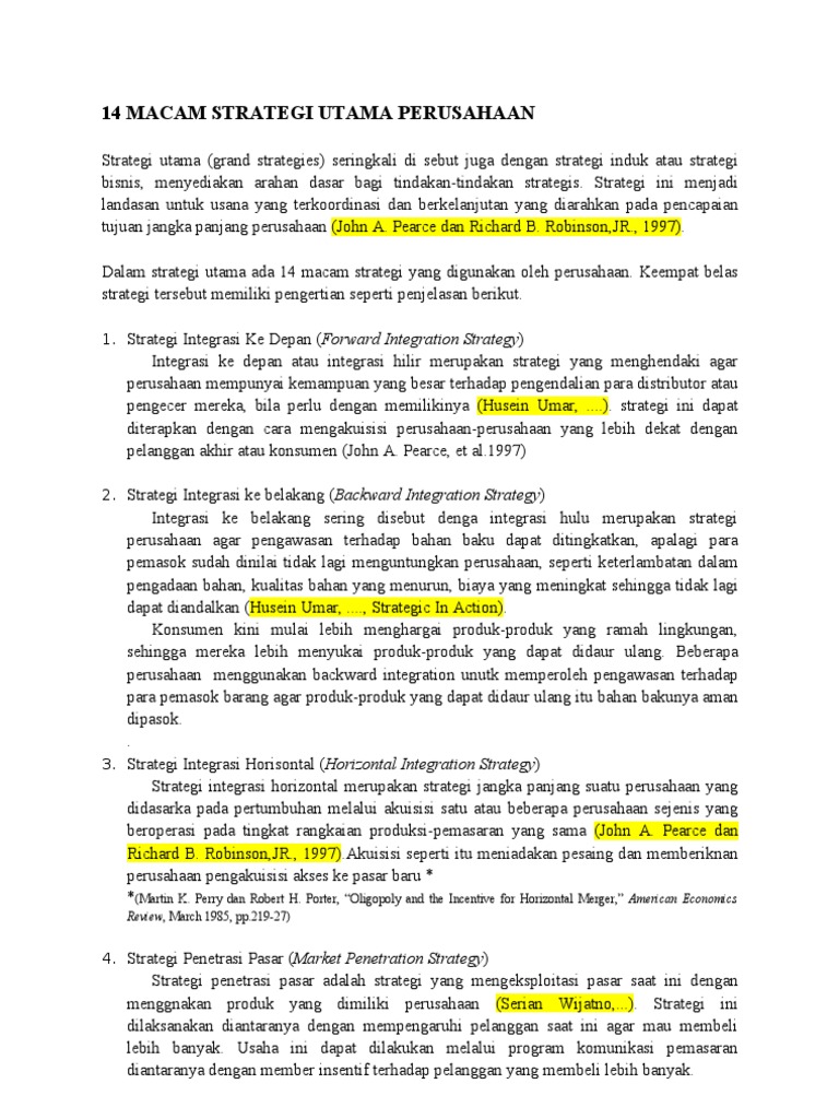 Macam-macam strategi.pdf - Macam-macam strategi Dalam ... View Macam-macam strategi.pdf from 210 ESPA4123 at Universitas Terbuka. Macam-macam strategi Dalam manajemen strategis yang baru, Mintzberg dalam Suryana (2010) mengemukakan 5 P yang sama artinya Berbagai Macam Strategi Bisnis yang Wajib Diketahui - Super Strategi Bisnis yang Wajib Diketahui. 1. Perhatikan Kualitas. Saat ini semakin banyak bisnis baru yang bermunculan dengan berbagai produk beragam. Namun, bisnis yang benar-benar memperhatikan kualitas dapat dibilang hanya sedikit. Kualitas dalam bisnis adalah hal penting yang perlu ditingkatkan untuk menarik banyak konsumen. √ Strategi Bisnis | Prinsip, Jenis, Contoh, Tingkat, Manfaat Pengertian Strategi Bisnis. Secara umum, strategi bisnis adalah berbagai macam upaya yang dilakukan supaya bisnis yang dijalankan bisa mencapai tujuan dengan efektif dan efisien. Tujuan di sini maksudnya adalah mendapatkan pendapatan yang maksimal dan keberhasilan dalam jangka panjang.