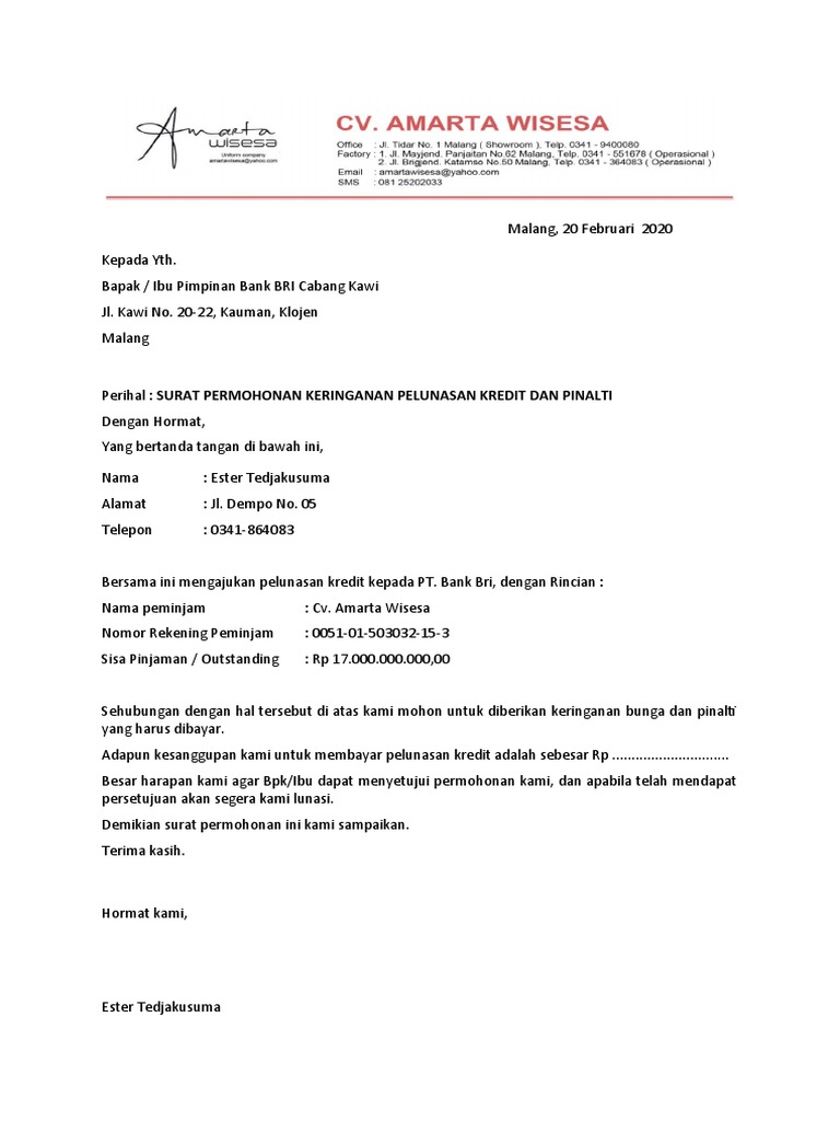 40 contoh surat permohonan restrukturisasi kredit bank ... Diawal pemakaian, pembayaran cicilan kartu kredit bank mandiri saya lancar saja. √ Contoh Surat Permohonan Keringanan Angsuran Bank BRI 2022 Contoh Surat Permohonan Keringanan Angsuran Bank BRI - Untuk kalian yang merupakan nasabah bank BRI, terutama untuk anda yang memiliki pinjaman.