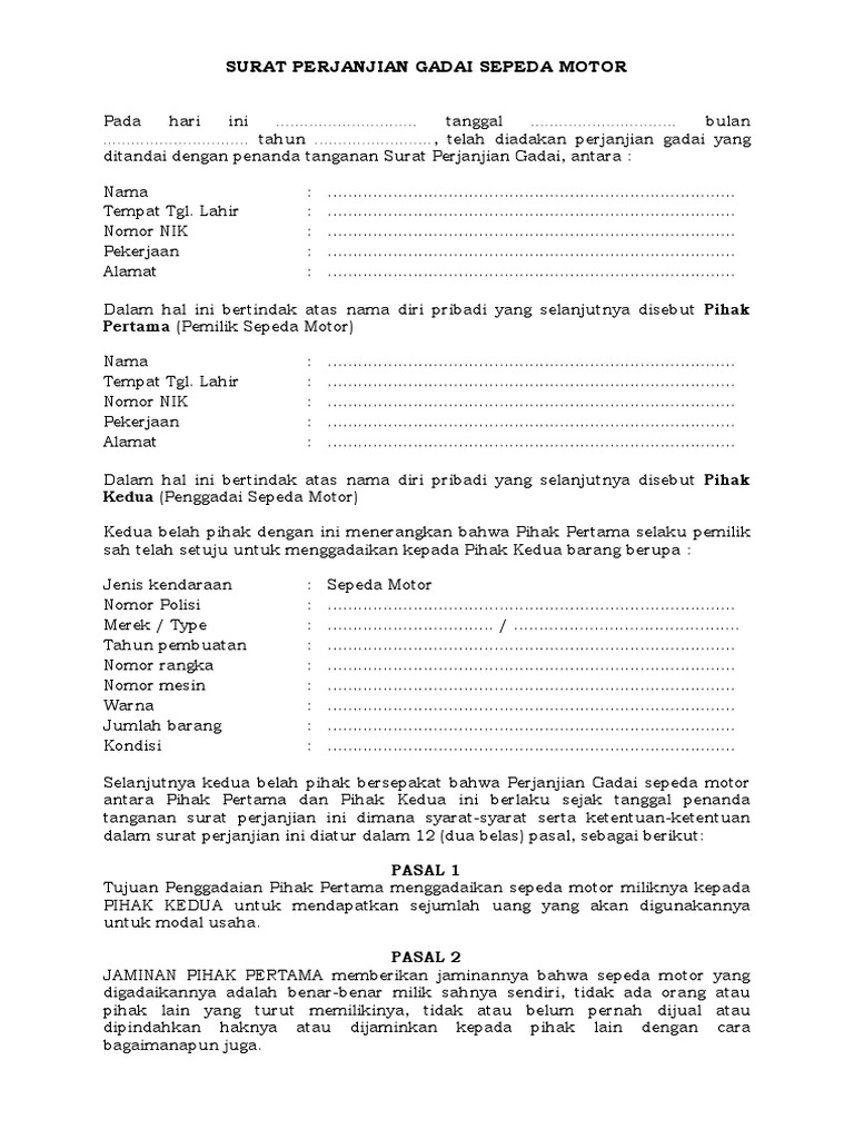 42 contoh surat gadai motor - Solusi Keuangan 42 contoh surat gadai motor. Written By admin Friday, April 1, 2022 Add Comment. Edit. Contoh Surat Perjanjian Sewa Kendaraan Bermotor Contoh Surat Perjanjian Sewa Kendaraan Bermotor berikut ini digunakan sebagai pengikat kesepakatan antara penyewa dan yang menyewakan kendaran tersebut. Kendaraan yang disewakan dapat berupa Sepeda Motor dan Mobil.