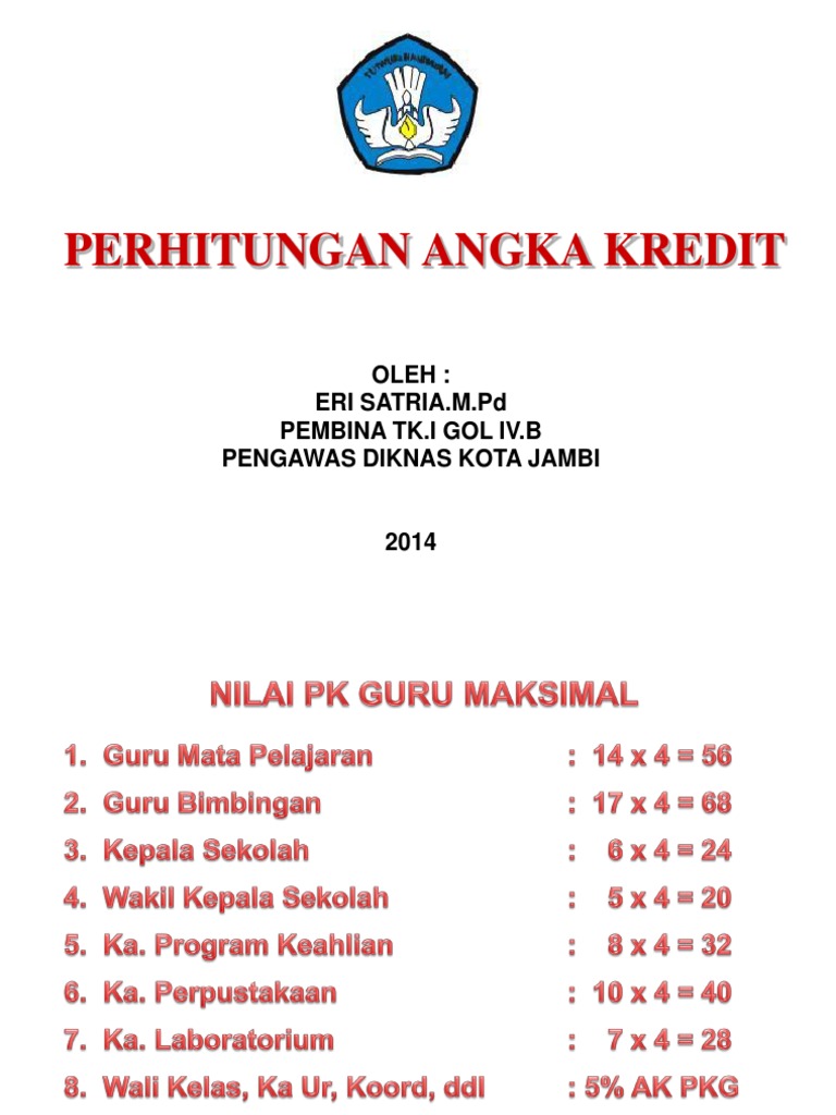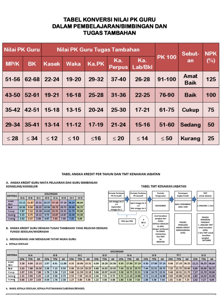 Angka Kredit Guru PNS untuk Kenaikan Pangkat nilanyapun dari point 100 sampai kurang dari 50, dan untuk penilaian kinerja guru sendiri dapat mempengaruhi angka kredit masing-masing guru sesuai dengan tugas utama jabatan fungsional guru di ekolah ada beberapa penilaian kinerja guru di ekolah seperti kepala sekolah, wakil kepala sekolah, guru mapel, kepala perpusatakaan, kepala lab, guru …