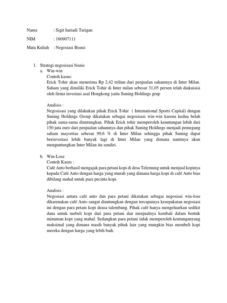 NEGOISASI YANG SUKSES DALAM KASUS BISNIS Bisnis Internasional ... Jun 04, 2016 · Negosiasi Sukses dalam Dunia Bisnis. Bernegosiasi dalam dunia bisnis merupakan hal terpenting untuk mencapai tujuan. Negosiasi adalah mengenai sikap. Orang dari budaya yang berbeda akan menggunakan gaya negosiasi dan pendekatan yang berbeda. Beberapa budaya memandang proses negosiasisebagai situasi “win-win” (menang-menang), yaitu suatu ...