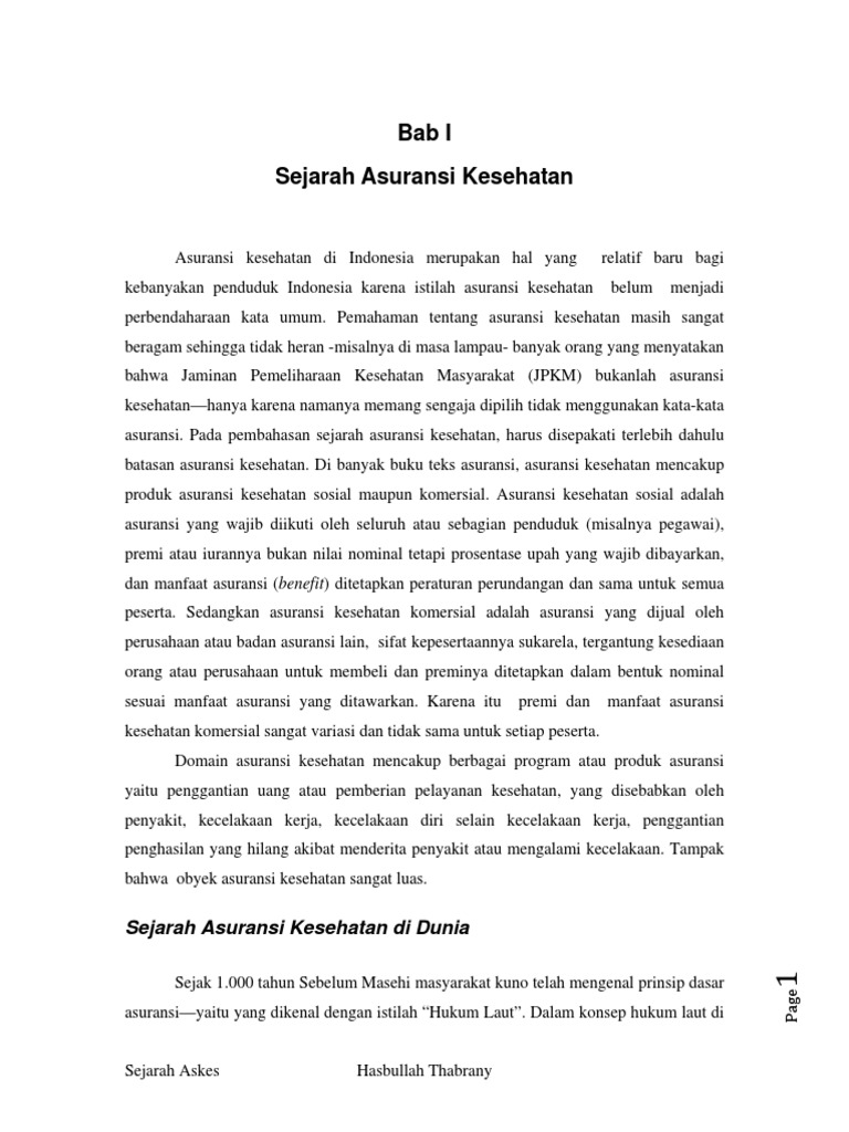 PDF Bab I Sejarah Asuransi Kesehatan edited Sejarah Asuransi Kesehatan di Dunia Sejak 1.000 tahun Sebelum Masehi masyarakat kuno telah mengenal prinsip dasar asuransi—yaitu yang dikenal dengan istilah "Hukum Laut". Dalam konsep hukum laut di Sejarah Askes Hasbullah Thabrany Page 2 jaman kuno, perahu-perahu mengalami kesulitasn mendarat akibat malam yang gelap gulita.